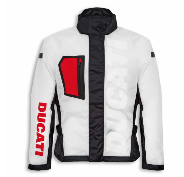 O máximo dos equipamentos técnicos e dos desempenhos junto ao design inconfundível em uma jaqueta impermeável, grifada Aldo Drudi e projetada exclusivamente para a Ducati com base nas instruções específicas dos pilotos de teste das Motos Vermelhas de Borgo Panigale. Realizada em poliéster e poliamida PVC free, os dois tipos de material permitem evitar a migração de cor e manter o aspecto original com o passar do tempo. Máxima impermeabilidade, igual a 10.000 colunas de água, otimizada pelas costuras internas termovedadas, pelo fecho duplo frontal com tecnologia acqua-stop e pelo amplo bolso externo impermeável, aplicado no peito com uma técnica de colagem avançada. Peça leve, resistente e extremamente prática, rápida de vestir e facilmente dobrável para ser colocada na específica pochete. O ajuste dos volumes nos braços e nos quadris e o fecho duplo frontal maximizam o seu conforto. Dotada de estampas refletivas e disponível nas versões de cor branca/preta e amarela HV/preta, para se adaptar ao visual de cada piloto e não renunciar ao inconfundível estilo Ducati nem mesmo nas condições climáticas mais adversas.